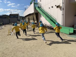 2月の天気の良い寒空の下、2~5歳児の子どもたちが元気いっぱい園庭を走るマラソン大会がありました。